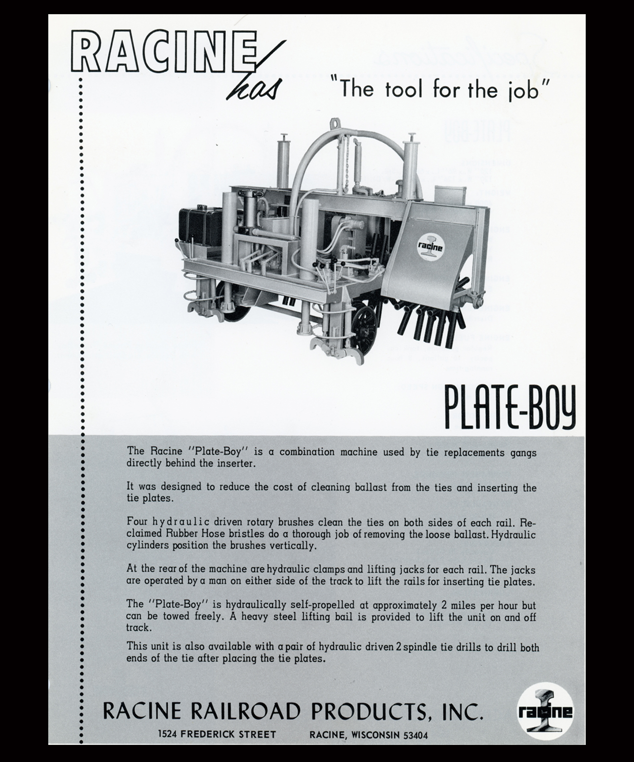 The Racine "Plate-Boy" was a combination machine used by tie replacement gangs directly behind the inserter.